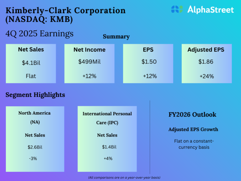 Kimberly-Clark Corporation (NASDAQ: KMB) reported its fourth quarter 2025 earnings results today. Net sales of $4.1 billion were...