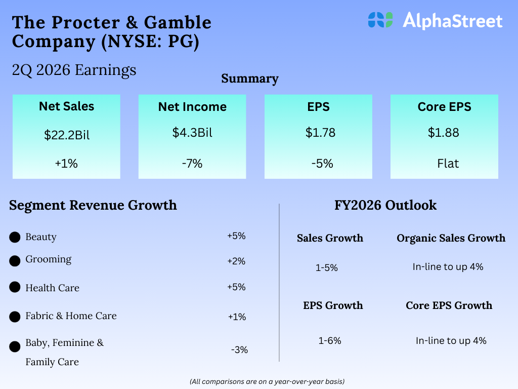 For fiscal year 2026, PG expects all-in sales growth of 1-5% versus the prior year. Organic sales growth is expected to be in-line to up 4%. The company now expects GAAP EPS to grow 1-6%. Core EPS growth is expected to be in-line to up 4%, which equates to a range of $6.83-7.09.