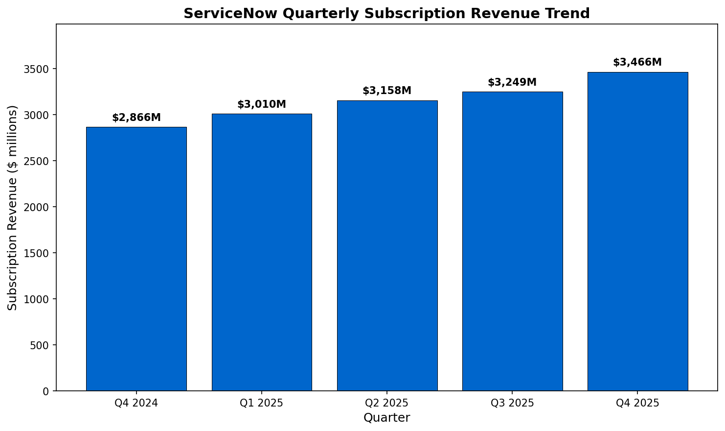 ServiceNow (NYSE: NOW) reported fourth-quarter 2025 financial results on January 28, 2026, with subscription revenues of $3.47 billion, representing 21% year-over-year growth. The company also announced a $5 billion addition to its share repurchase program.