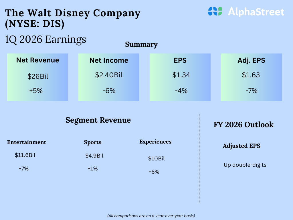 In the first quarter of 2026, Disney’s revenues increased 5% year-over-year to $25.98 billion, beating estimates of $25.56 billion. On a GAAP basis, earnings per share fell 4% to $1.34. Adjusted EPS declined 7% to $1.63 but surpassed projections of $1.57.